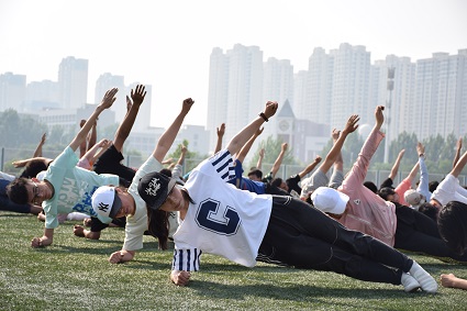 极富节奏感的音乐响起,同学们在舞蹈老师的带领下开始了热身训练。纵使骄阳似火,但同学们的热情更加火热,拉伸,跳跃加强了同学们的身体协调性。扎马步,平板支撑体现了大学生坚持不懈的精神。随着身体的舒展,舞蹈老师们开始教授动感十足的舞蹈动作,传达出了舞蹈的魅力,用舞步诠释了生命的价值。