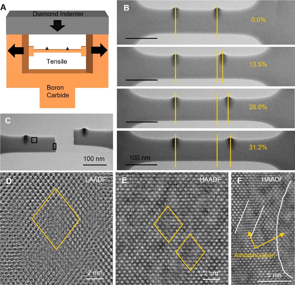 图2. B4C纳米梁原位拉伸变形过程及其塑性变形区域的高分辨率STEM表征