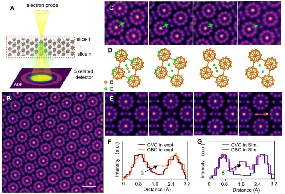 图1.通过4D-STEM成像技术对B4C晶体原子结构及硼空位的精确表征