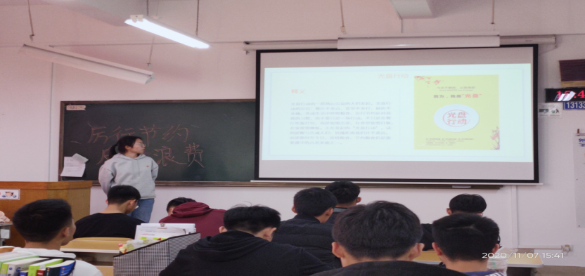 艰苦奋斗、勤俭节约是中华民族的传统美德,作为共青团员,我们更要树立“节约光荣,浪费可耻”的意识,自觉杜绝浪费行为20级材料七班团支部开展了“厉行节约,反对浪费”团日活动。活动开始团支书介绍了舌尖上的浪费接着引入光盘行动,重点阐述光盘行动的重要性。活动最后同学们共同提出节约建议,从日常生活中的小事做起,节约用电、用水、办公用品,每人进步一小步,合起来就是社会的一大步。