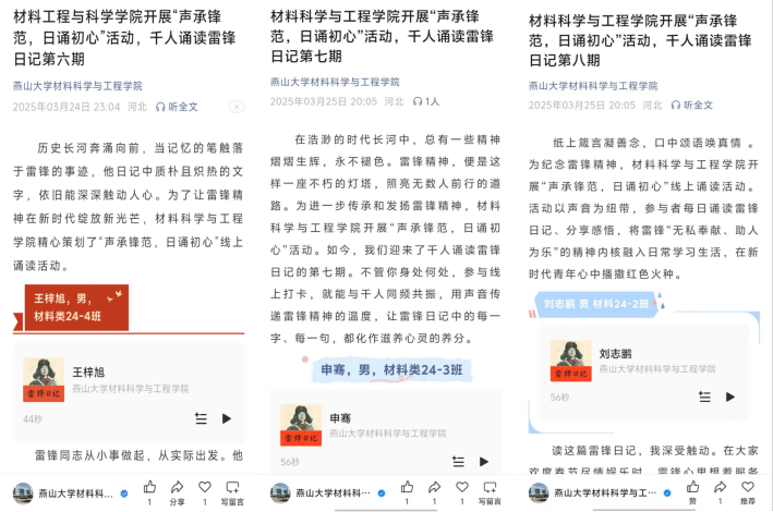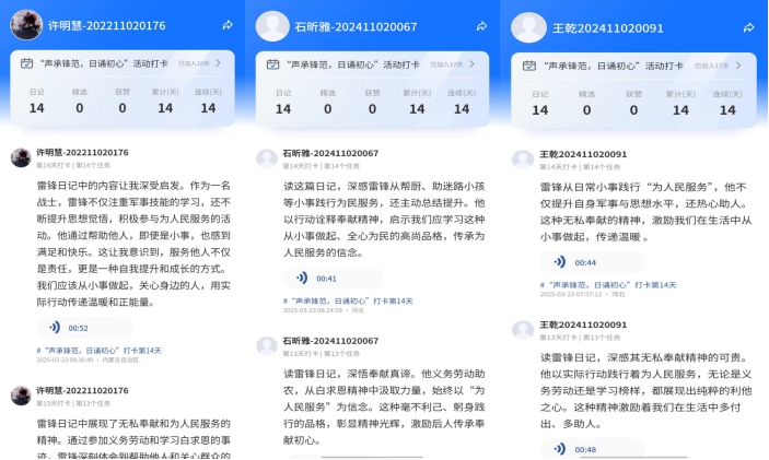 活动期间,参与者每日登录专属打卡平台,认真阅读雷锋日记并撰写感悟上传。雷锋日记里,既有他对党忠诚热爱的拳拳之心,也有他在日常工作与生活中无私奉献、助人为乐的平凡而伟大的点滴事迹。这些内容如同一束束温暖而明亮的光,深深触动着每一位参与者的心灵。大家纷纷在打卡留言区分享自己的阅读心得,有人感叹雷锋精神在平凡中彰显伟大,有人表示要以雷锋为榜样,在学习工作里更加尽职尽责,将奉献精神融入每一项任务中。为进一步彰显参与者们的积极态度与坚持精神,学院将优秀感悟精心整理成册,发布在学院公众平台上。这不仅让更多人能够领略到同学们对雷锋精神的深刻理解和感悟,也进一步扩大了活动影响力。