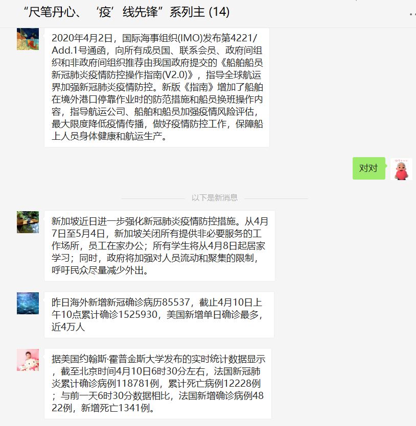党委博士研究生第二党支部全体党员,在党支部书记赵佳莉的主持下,于2020年4月10日以微信群形式,开展了主题为“关注全球疫情防控动态”的主题党日活动。