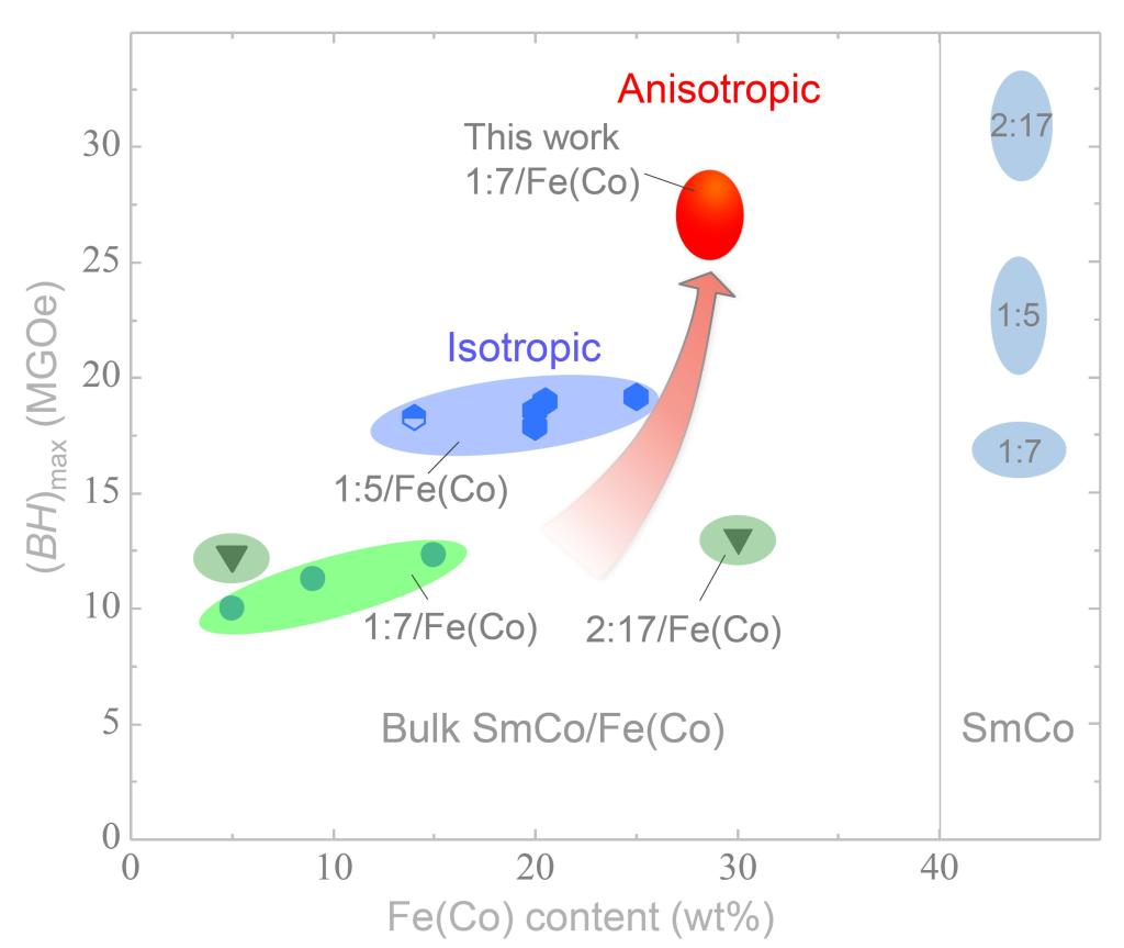 块体SmCoFe(Co)纳米复合磁体以及纯SmCo稀土磁体的磁能积比较