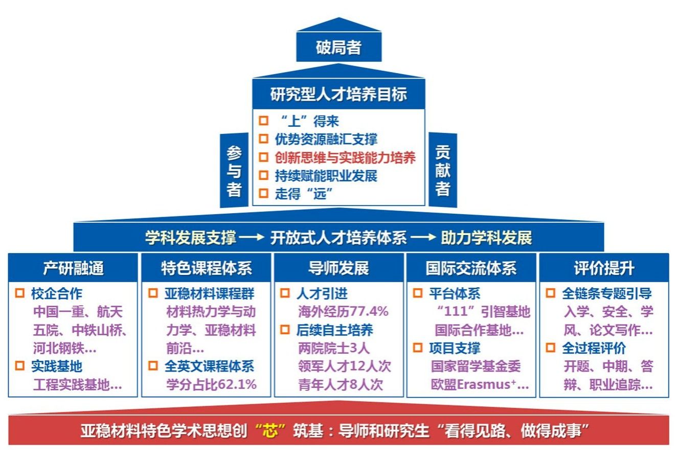 本成果遵循研究生教育规律,发掘材料学科“亚稳→相变”的特色育人内涵,淬炼“学术思想→价值观塑造”之“芯”,激活人才成长的“自由能曲线”,服务开放式自主创新能力培养需要;确立了研究型人才培养目标,特色学术思想引领研究生创新实践,激活价值观塑造“相变”过程,将以家国情怀为核心的价值观塑造融入研究型人才培养的起点,向着立德树人根本任务的原点回归;构建了“导师发展、特色课程、国际交流、产研融通、评价提升”多维度、一体化开放式培养体系,支撑研究生创新能力培养与职业发展全链条贯通,锚定国家需求、开阔国际视野,促进了研究型人才培养水平的显著提升。